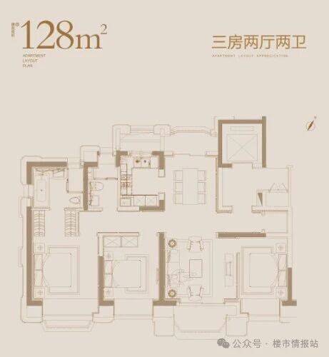 主卧为豪华套房设计,配备独立卫浴、步入式衣帽间与观景飘窗,私密度与舒适度兼具,主人起居尽显尊崇;双卫设计干湿分离,早高峰无需争抢,兼顾实用性与便利性。整体户型方正通透,无浪费面积,得房率优异,128㎡做出媲美大平层的空间体验,完美适配三口之家、二胎家庭乃至三代同堂居住。