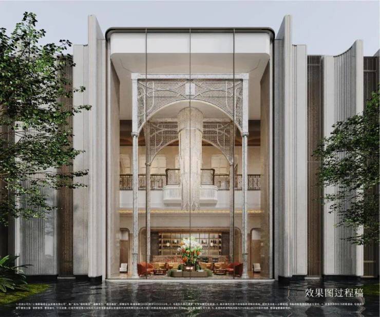 在建筑表达上, 深度萃取 巴黎白马庄园 (Cheval Blanc Paris)核心美学,同时融合 上海花园饭店、和平饭店、张园石库门 等东方海派建筑元素,以“仪式感、纯粹性、细节感”为核心,打造兼具国际风范与海派底蕴的建筑格调 仪式感 上,对称式布局搭配精致雕花纹饰,入户动线仪式感拉满;