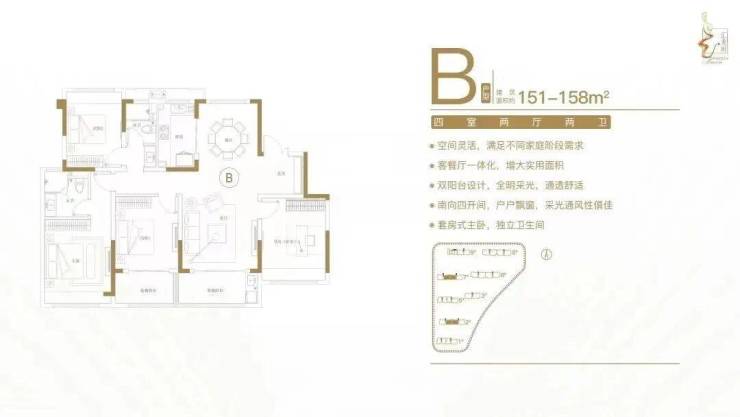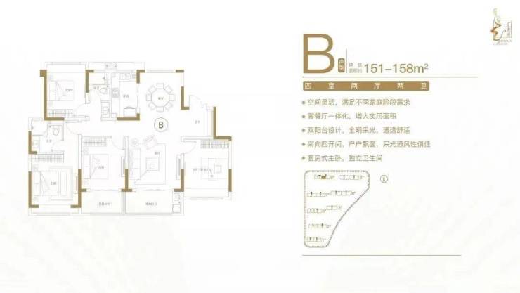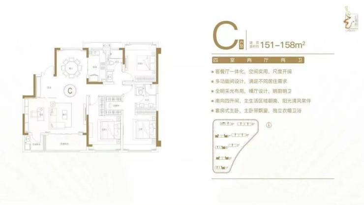 建面约151-158㎡四室两厅两卫户型特点: 空间灵活,满足不同家庭阶段需求;客餐厅一体化,增大实用面积;双阳台设计,全明采光,通透舒适;南向四开间,户户飘窗,采光通风性俱佳;套房式主卧,独立卫生间。