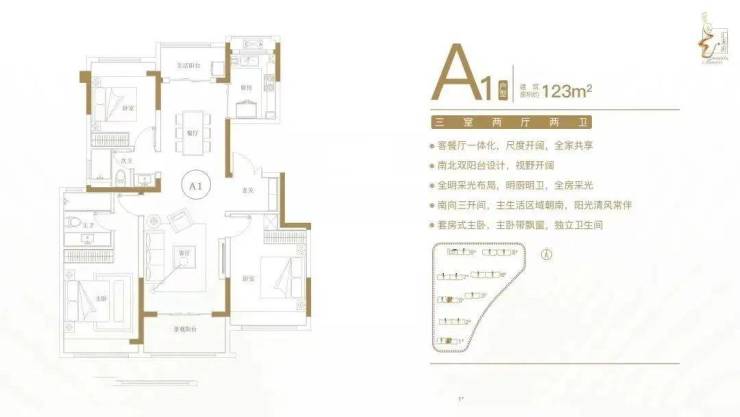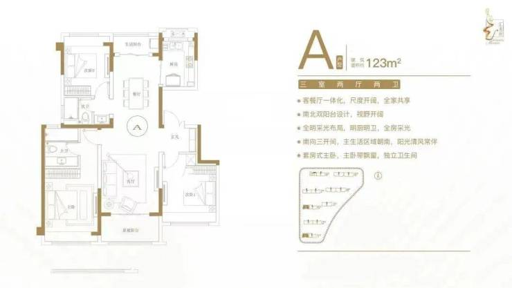 建面约123㎡三室两厅两卫户型特点: 客餐厅一体化,尺度开阔,全家共享;南北双阳台设计,视野开阔;全明采光布局,明厨明卫,全房采光;南向三开间,主生活区域朝南,阳光清风常伴;套房式主卧,主卧带飘窗,独立卫生间。
