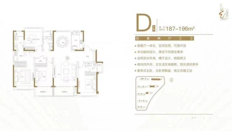 建面约187-196㎡四室两厅三卫户型特点: 户型方正,南北通透,动静分区有序;双套房设计,卧室带飘窗,独立卫生间;客餐厅一体化,尺度开阔,全家共享;全明采光布局,告别暗房,明厨明卫;南向四开间,阳光清风常伴。