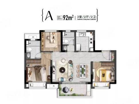 2. 建面约 92㎡三房两厅两卫:改善家庭一步到位,总价 420 万起