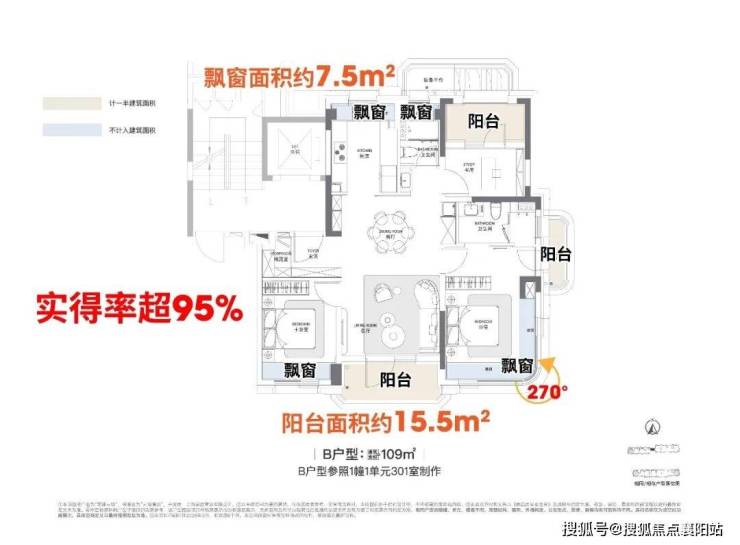 户型设计上,多阳台+一步飘窗(部分边套)+应飘尽飘,实得率超95%。