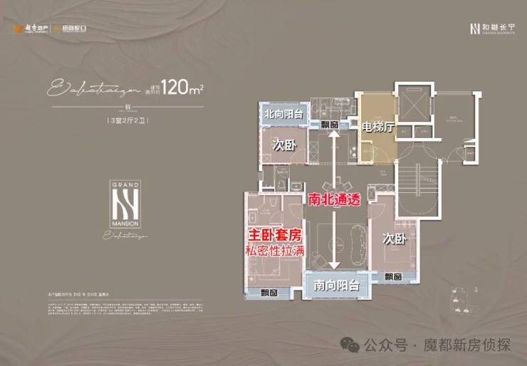 项目建面约120㎡户型也是 类独立电梯厅 的设计,室内则是标准的 南北通透+三开间朝南设计 ;主卧套房配置,自带卫生间,私密性和舒适度俱佳。