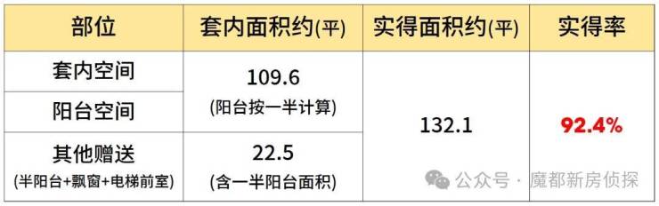 更重要的是,该户型划时代的做到了 3阳台设计 ,尤其是南向约8m的超跑级阳台,非常震撼!如果把阳台、飘窗和电梯厅等实得面积都加一起,实际可利用面积超过132㎡, 实得率超92%。 (该实得率数据根据实得面积预估计算所得,仅供参考,不作为置业依据。最终得房率以购房合同为准)