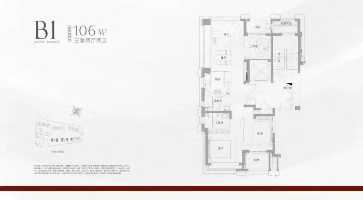 建面约106㎡三房两厅两卫(边套):三面采光,客厅270°采光窗搭配大面积飘窗,揽景入室;南北双阳台设计,兼顾功能与诗意;过道预留储物空间,细节之处尽显匠心。
