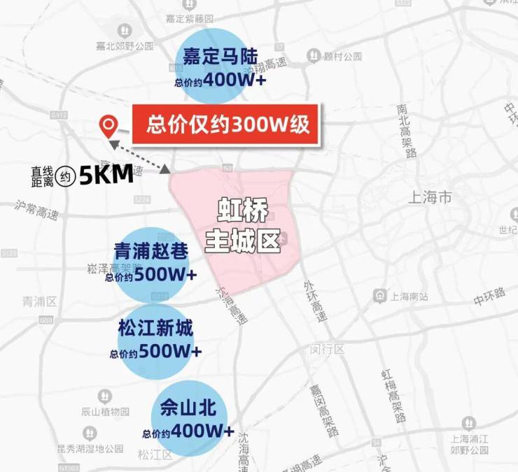 通过百度地图测距我们发现: 安亭距离虹桥主城区直线距离仅约5公里,但总价仅约300万级!