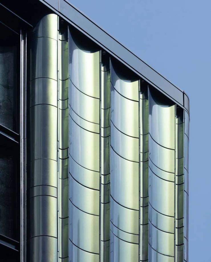 来到项目会所,就被其 流光幻彩铝板的外立面 所吸引。 不同角度有不同颜色呈现,造价昂 贵。大堂的玻璃也很吸睛,用的半钢化夹胶反弯弧玻璃,半径仅为约600mm,施工难度大、成本高!