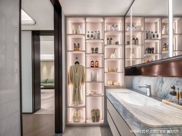卫生间镜柜配备美妆冰箱、倒置抽纸等等定制分隔。