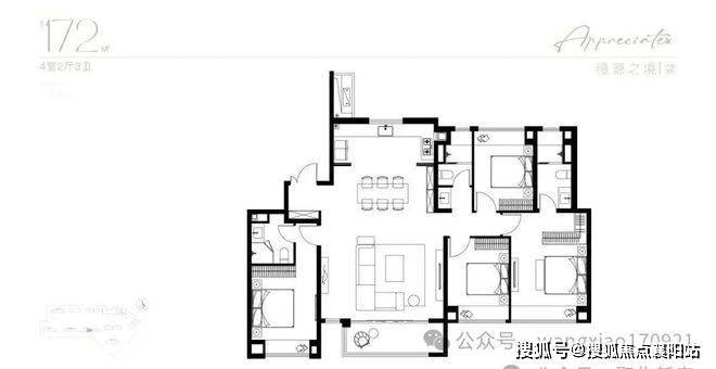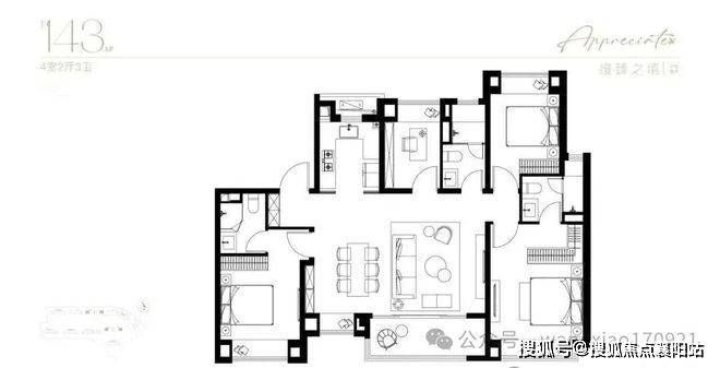 建面约143㎡四房:双套房+7.2米横厅