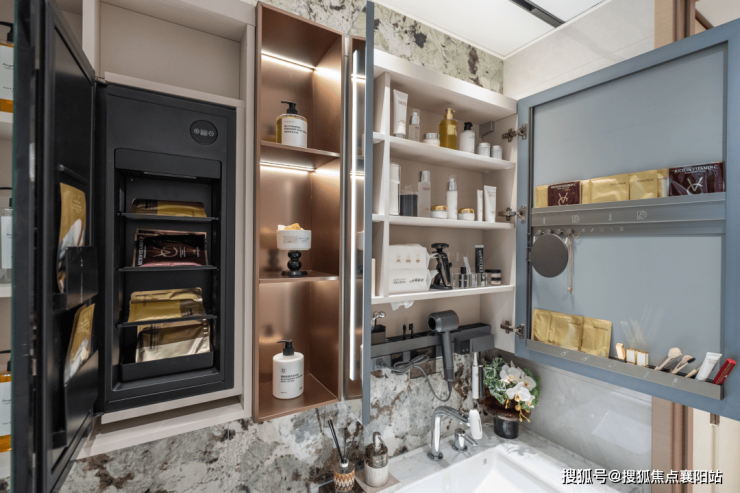 卫浴: 镜柜内置分区、卫浴柜斜翻抽 等设计,为女主人量身定制。 美妆灯与抽拉龙头 的 “感官SPA” 系统,将洗漱升级为一场全方位的护理体验。