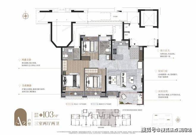 这是项目的明星户型。三开间朝南+大横厅布局,主卧配备270°转角飘窗,实现双倍采光-2。全屋配置5个飘窗,通过飘窗、设备平台的合理赠送,实际使用体验堪比110㎡+的旧户型-4。