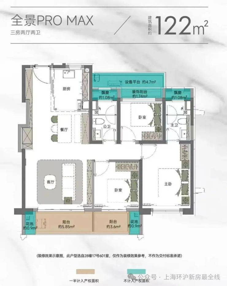 以105㎡的户型为例, “三阳台”搭配花池的设计 ,直接性价比拉满,按照规定: 阳台计一半面积,花池不计面积 ,加上 主卧+卫生间还带飘窗 (主卧飘窗非承重结构),如此算下来,对购房者而言,日常可以实打实 利用到的面积是远超市面上其他三房产品。