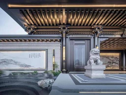 威仪大门 :社区主入口打造 **“青承门”**,承袭中式府门规制,气派庄重、挑高设计,搭配石狮、照壁、铜质装饰,彰显门第威仪,归家第一步便充满尊崇感。