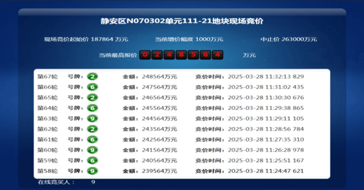 3月28日,上海2025年第三批次土拍,大华集团以总价24.85亿竞得静安大宁111-21地块,溢价率32.31%, 折合楼板价92659元/㎡。装修标准不小于5000元/㎡。