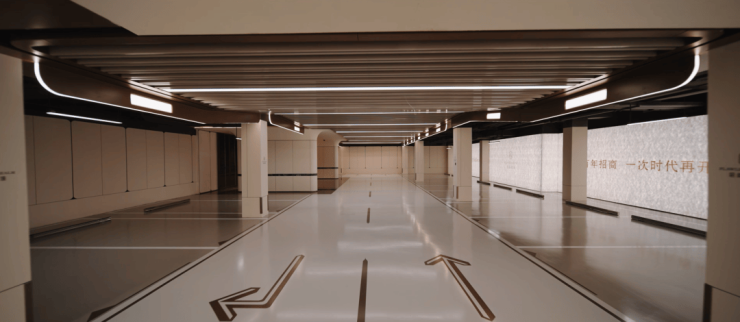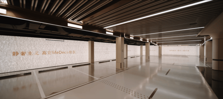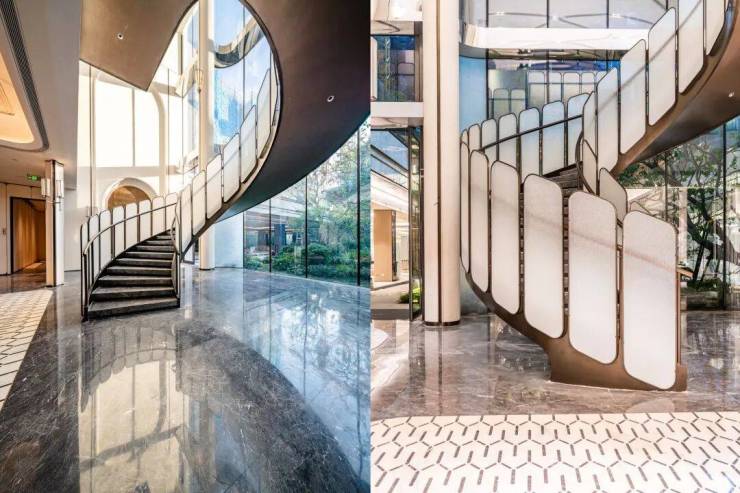 过去在豪宅项目才能看到的类似于“星空顶”地下车库坡道,招商臻境使用了看来 更加高级的香槟金色吊顶,并加上穹顶闪耀的“追光”坡道! 精装的地下大堂,配置了