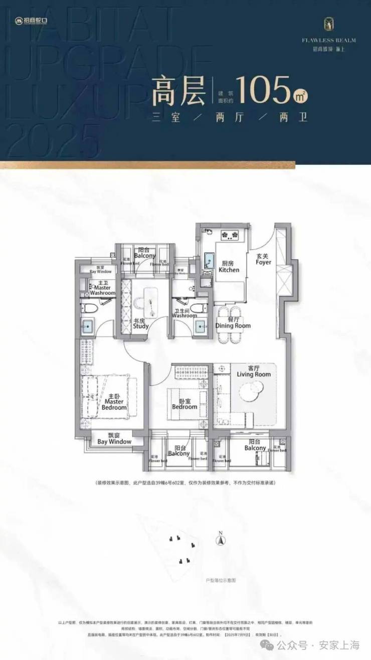 建筑面积约105㎡三房,进阶改善绝版“三阳台”户型,主力总价段约700万级,部分房源总价约650万级。