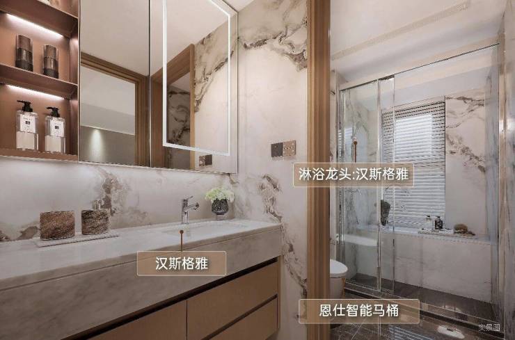 卫浴 :杜拉维特台盆、汉斯格雅龙头、科勒洁具,主卧套房带双台盆、独立淋浴房,品质奢华。