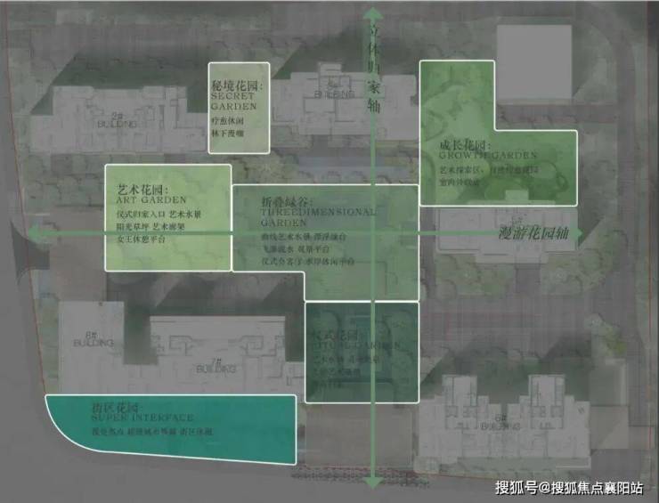 设计灵感源自 新加坡艾迪逊酒店 与 《天空之城》“漂浮的拉普达” ,以 “ 双轴五园 ” 为架构,打造约108 米南北立体归家轴、约90 米东西漫享花园轴,串联 仪式花园、下沉庭院、儿童乐园、秘境花园、艺术花园 五大花园