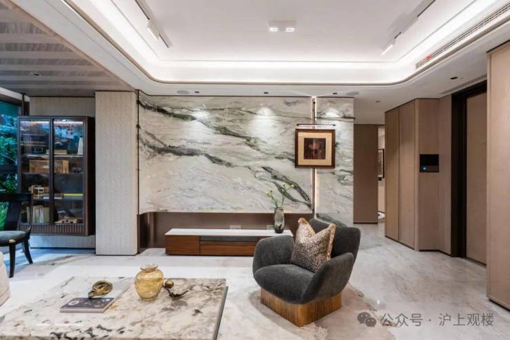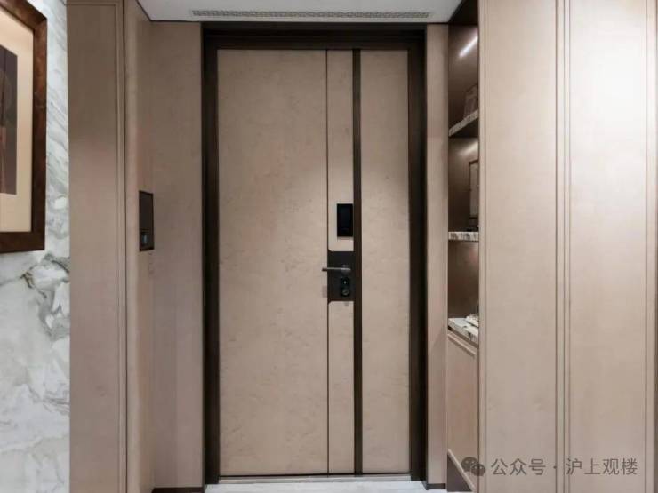 入户做了精致玄关柜,柜门为温润木饰面包裹,壁龛选用奢石映衬,质感非常棒。