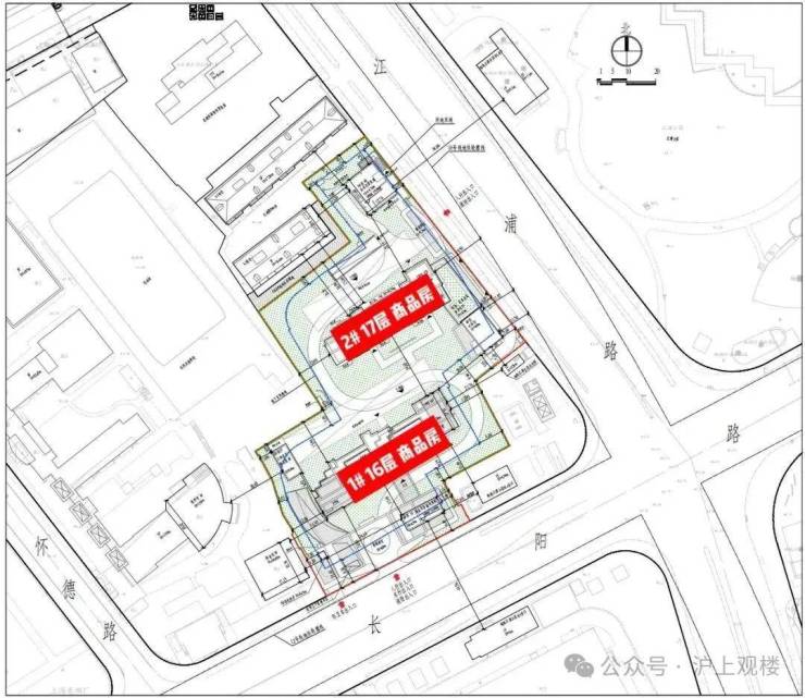 人行出入口、车行出入口、消防出入口,设置在南侧长阳路上,并设置1个临时上下客停车位;西侧江浦路设置人行出入口兼顾消防出入口