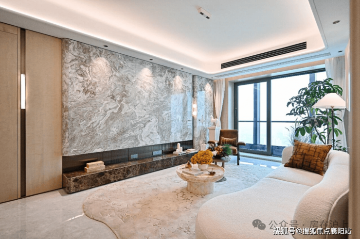 景观轴的原点——“鎏金画廊”,以整面老虎玉奢石为背景墙,顶部悬挂着厚度仅6毫米的手工打磨弧形艺术灯罩,将归家仪式感升华至艺术层面。