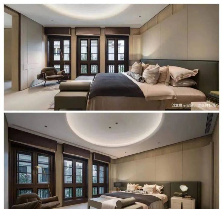 三楼整层为主卧套房, 样板间设计了双开门入卧室,进入起居空间,样板间选择在这里放一些艺术装饰、设计吧台来彰显主人品味。