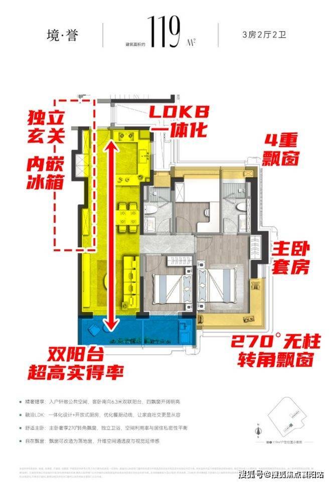 南向加宽的双阳台设计,是3.5代住宅辨识度的标签之一。阳台进深被有意放宽,未来可通过打通南次卧与客厅之间的非承重墙,形成约6.2米的贯通式景观大阳台,面积接近10㎡。12万/㎡!誉静安88,推建面约112-119㎡三房