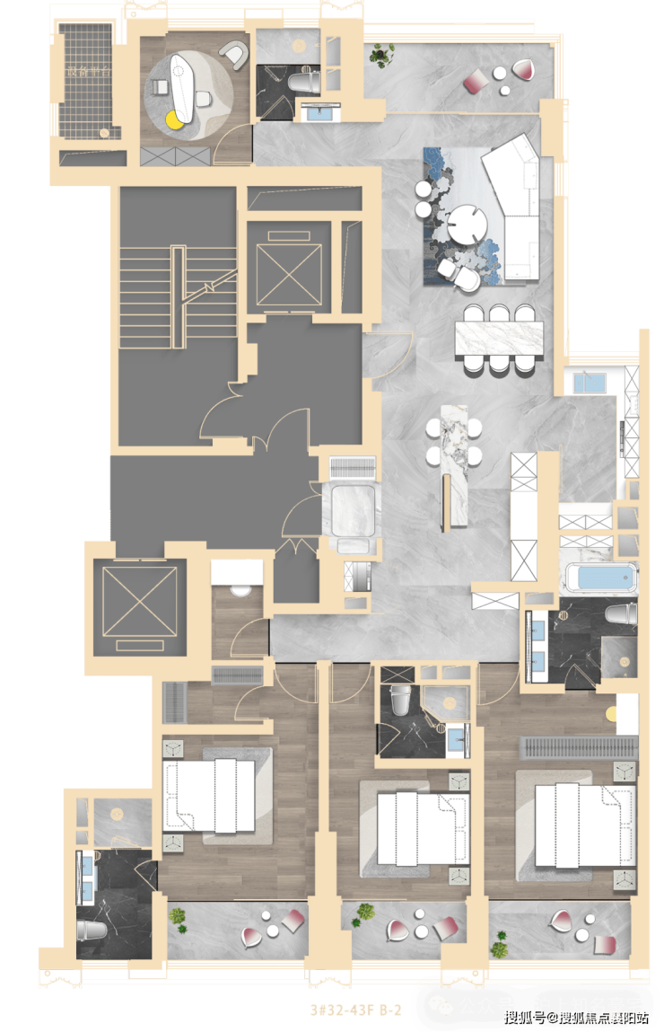 建面约 196㎡三房两厅三卫 :总价约 2774 万起,户型方正,三开间朝南,全明通透、三卫设计,得房率近 78%,空间利用率极高,适配三口之家、二孩家庭。