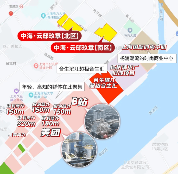 中海·云邸玖章距离江岸直线距离仅约500m , 作为当下片区内离江最近的项目,享美团、B站、 超级合生汇 等地标综合体配套,杨浦滨江生活中心。
