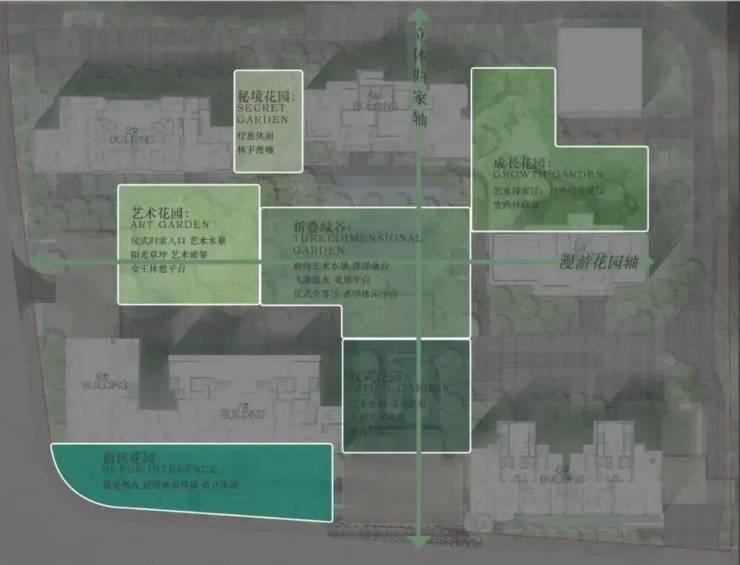 设计灵感源自新加坡艾迪逊酒店与《天空之城》“漂浮的拉普达”,以 “双轴五园” 为架构,打造约108米南北立体归家轴、约90米东西漫享花园轴,串联仪式花园、下沉庭院、儿童乐园、秘境花园、艺术花园五大花园;