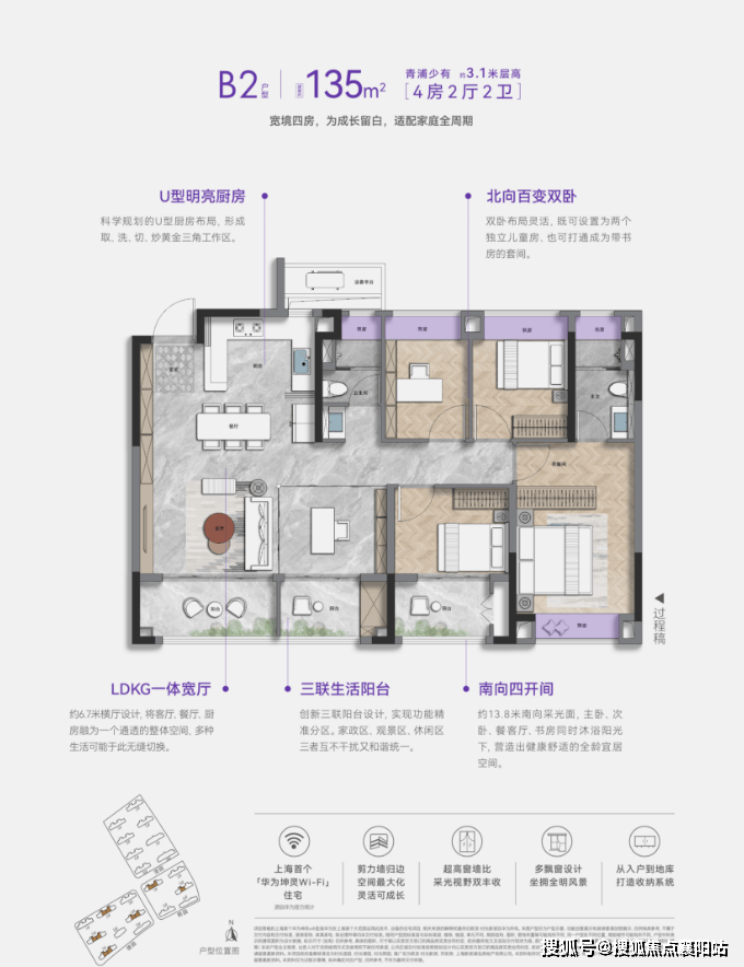 我们以135m²4+1房户型为例: