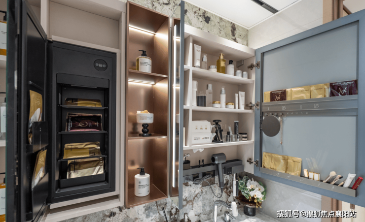 镜柜里做了分区收纳,卫浴柜还有可翻折的抽屉,在这里能一站式完成化妆,不用占用卧室空间。另外,美妆灯和抽拉龙头组成的“感官SPA”系统,把日常洗漱变成全方位的护理体验,细节里都是对自己的呵护。