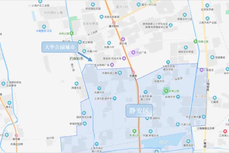 从区位格局来看,项目踞守中外环间核心腹地,东接静安、南连大宁、西靠宝山主城,是三大板块的交通枢纽与生活衔接点。直线距离静安区仅约400米,步行即可抵达静安边界,无缝享受静安的高端商业、优质教育、医疗资源;距离大宁核心区域仅约5公里,驾车15分钟即可抵达大宁国际商业广场、大宁久光中心等高端商圈,真正实现“一碗汤的距离”,兼顾繁华与静谧。