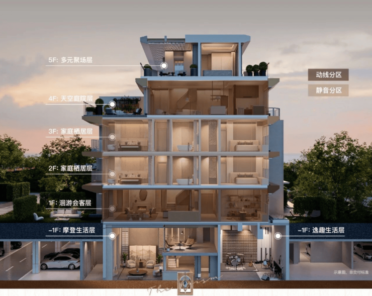 第一个首创,是“二跃三层结构”。上海首个打破传统叠墅两层格局的产品。下叠地上2层加超高层高的奢阔地下空间;上叠从传统的2层加阁楼,变成了真正意义上的3层,而且也同样拥有地下空间,这样一来,顶层不再是“鸡肋”,而是可以随心定义的多功能空间,今天可以是亲子区,明天可以是健身区,后天可以是空中书房。