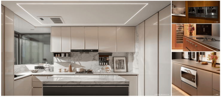 全系进口嘉格纳十件套,覆盖中西烹饪。烟雾、燃气、水浸三重智能报警构建安全防线。华为智能系统协同大金空调实现定点送风;三重净烟(嘉格纳油烟机+大金厨房空调二次过滤+中央排烟)彻底杜绝油烟倒灌。316L不锈钢水管+怡口前置/末端+滨特尔中央净水/软水,水质达医疗级标准。