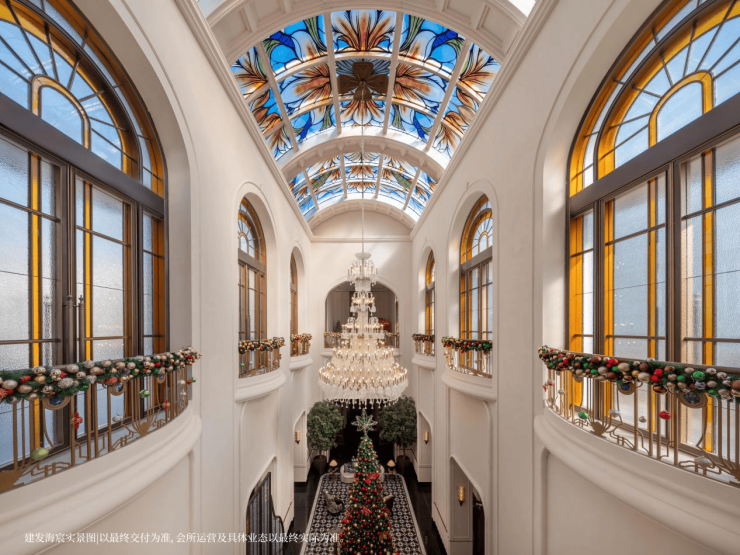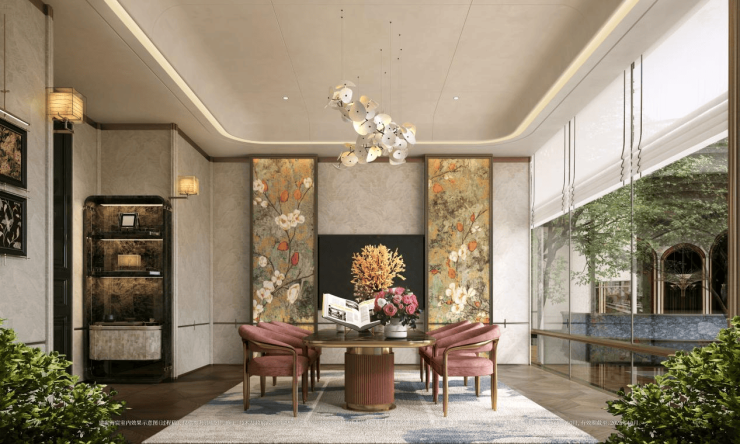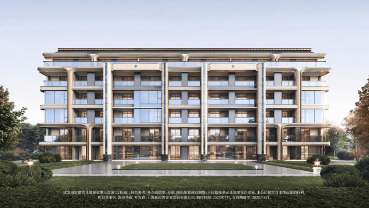 楼间距约 30 米,层高普遍 3.05-3.1 米,部分滨水大户型达 3.2 米,搭配 78%-88% 的高得房率,空间感特别足,住起来不拥挤、不压抑。建筑风格是海派东方美学,外立面用铝板 + 玻璃幕墙 + 高端石材,搭配玉兰门庭、飞翼祥纹铜雕,既有东方礼序,又有海派摩登,大气又耐看。