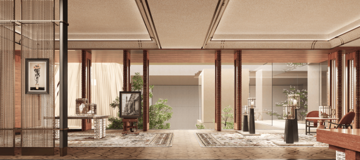 项目的园林景观设计紧扣「拾光映象」理念,让镜面水景、古木纹石材与艺术雕塑,共同复刻源福里的往昔剪影。