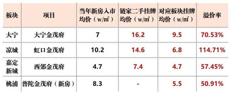 据贝壳数据统计, 金茂府与同板块二手房相比,挂牌均价比板块均价高出 50%以上 ,最高溢价甚至突破 114.71%!