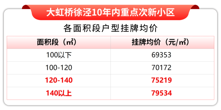 据链家网最新挂牌数据显示,目前徐泾10年内次新重点小区100㎡以下户型挂牌均价已经跌破7万/㎡。但 140㎡以上的大户型却仍然有近8万/㎡的挂牌均价,溢价小户型近15%!