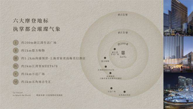 项目周边汇聚五大商业体,距离项目200m就是新江湾生活广场,约1km就是悠方购物广场,约2km是江湾里MEET678,更有美高梅酒店强势入驻,约3km是大学路街区,3站地铁就可以直达五角场商圈:合生汇、万达广场、百联,苏宁易购等,满足日常购物及生活所需。