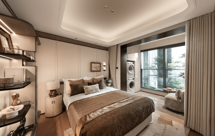 项目整体占地约 3.2 万㎡,总建面约 12.8 万㎡, 容积率仅 2.3 ,绿化率高达 35%,规划总户数约 426 户,车位配比 1:1.2,是内环滨江极为稀缺的低密纯住宅社区。建筑风格采用现代极简美学,外立面用 全铝板 + 玻璃 + 石材 组合,质感对标市中心 15 万 + 豪宅,历久弥新。
