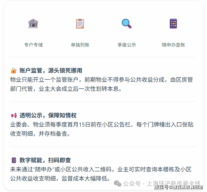 长期以来,电梯广告费、停车费、公共场地租金等“公共收入”成了困扰业主的“糊涂账”。 如今,上海正式出台《上海市住宅小区公共收益管理办法》,建立监管账户制度, 让每一分公共收益都“入账为明,用款有据”。