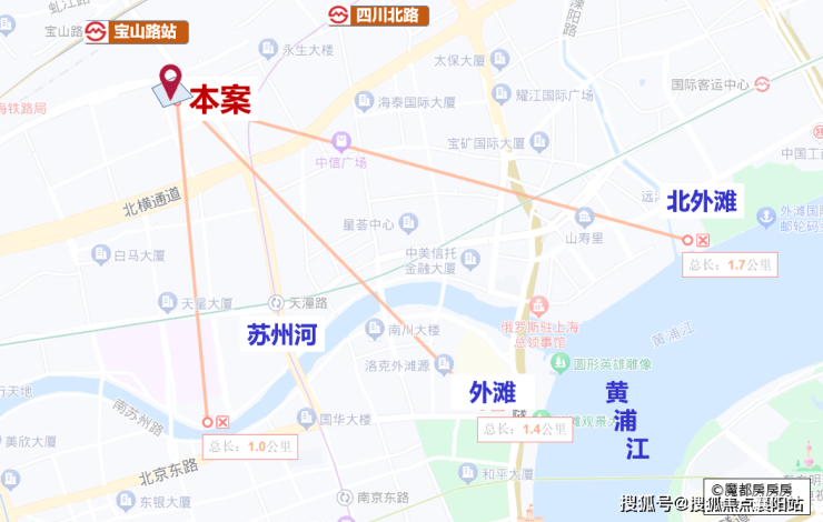 仅从图上看,该地块直线距 苏州河约1公里,直线距 外滩约1.4公里,直线距 北外滩约1.7公里,直线距 3/4号线宝山路站约300米,直线距 10号线四川北路站约560米,区位优势明显。
