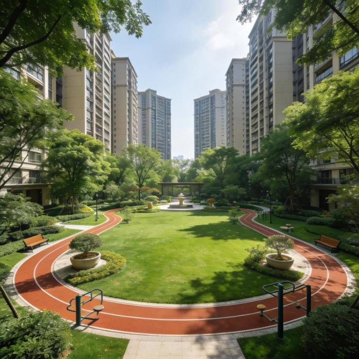 而且,社区里还打造了 400 米的环形健身跑道,围绕着中央花园,平时早上起来,跑跑步,锻炼一下身体,呼吸着新鲜的空气,别提有多舒服了。还有儿童游乐区、老年活动区、邻里会客厅等等全龄的活动空间,孩子有地方玩,老人有地方聊天,年轻人有地方健身,满足全家人的需求。
