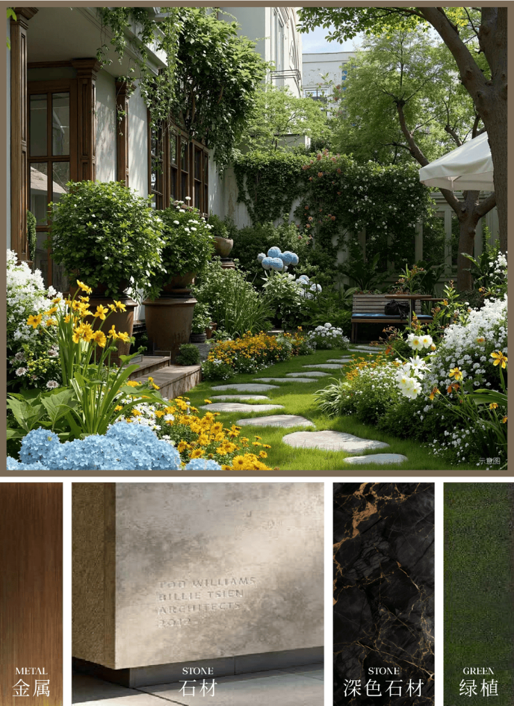 风景随高定巷道变换,紫薇花开时绚烂,樱花飘落时温柔,不同的季节,不同的巷口,总有不一样的风景静候。同时,通过地形抬高、植物屏障与艺术格栅,从开放的社区步道,专属的入口花境,到完全私家的庭院,公共-半私密-私密的层级被精心塑造,完美平衡社区的开放交融与居者的静谧独处。