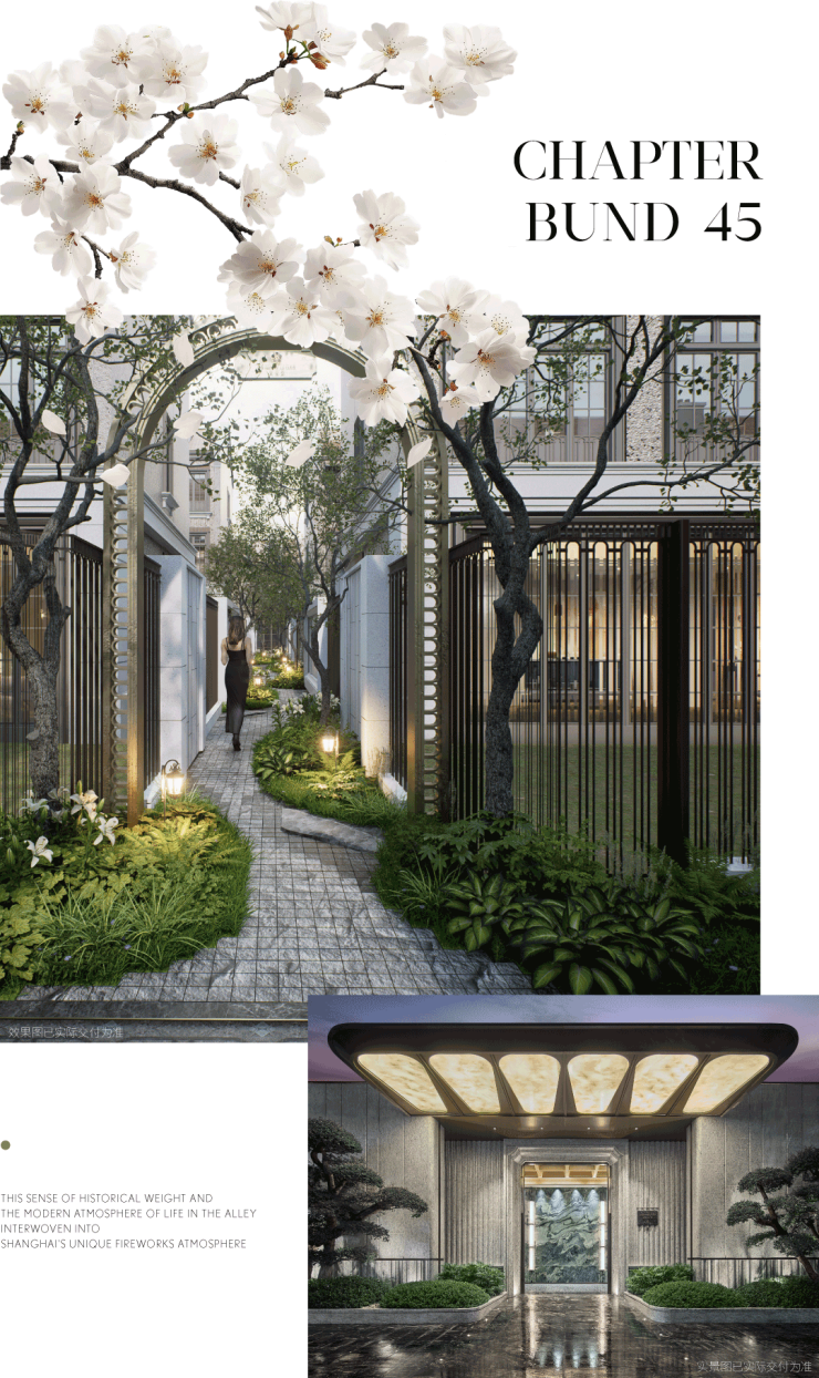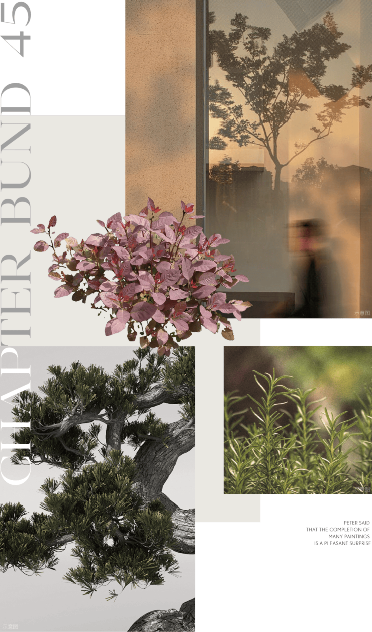 对美好的追求近乎执念,保利·外滩序BUND45设计师团队跨越千里寻苗,园林中每一棵姿态独特的红花继木、龙柏、迷迭香、松树,皆历时数月、踏遍数省、从上百棵候选树木中寻得的唯一,为园林奠定了无可复制的风骨与灵魂。并通过框景、对景等古典手法的现代运用,让行走的每一步,眼前皆如一幅精心构图的画作。