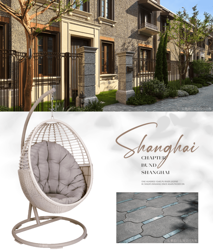 对百年前花园别墅生活方式进行细致的图像学、文献学和社会学研究,重塑场所精神,将昔日的沙龙移至廊架之下、草坪之上,让经典生活方式在当代复兴。同时,将老上海的视觉符号进行淬炼,石库门的威仪,化为门廊的挺拔线条,老虎窗的几何感,融入廊架与座椅的剪影;Art Deco的装饰,成就铁艺大门的纹样,地面抽象演绎老洋房马赛克地砖的拼花铺装。在这里,历史不再是橱窗里的展品,而是可触摸、可体验的生活场景。