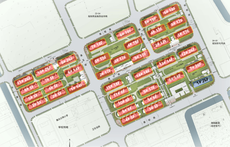 根据公示图显示,该项目的4个小板块最高层为项目东南角和西北角的26层高层,共有6栋,高度接近地块限高的80米(77.80米);18层的共有8栋;17层共有6栋;14层共有4栋;13层共有2栋;6层的共有4栋;5层的共有8栋。