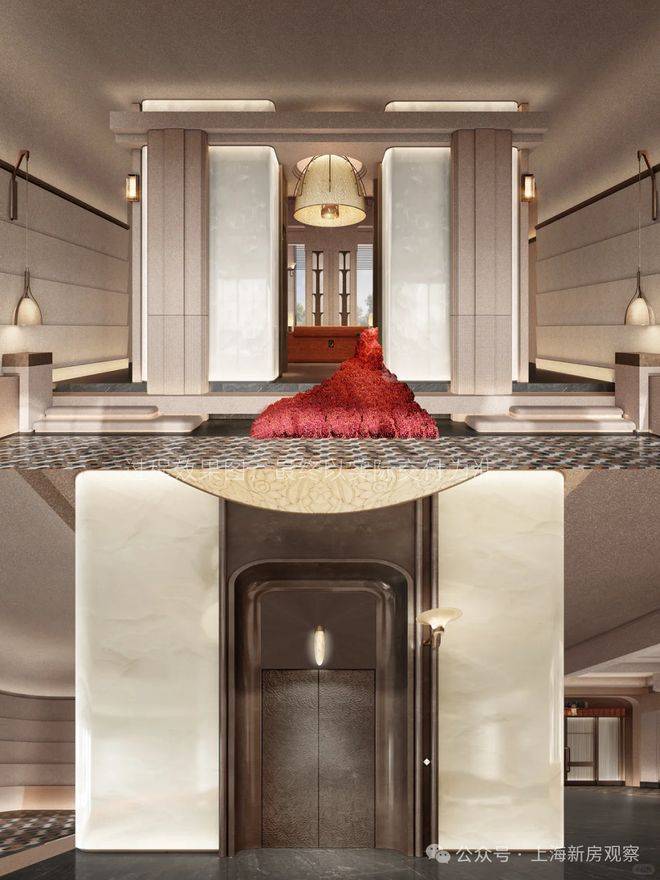 公区方面,从归家社区大堂、大堂序厅、以及入户单元大堂一路看过来,体现出一套脉络完整,层层递进的海派顶奢设计语言。